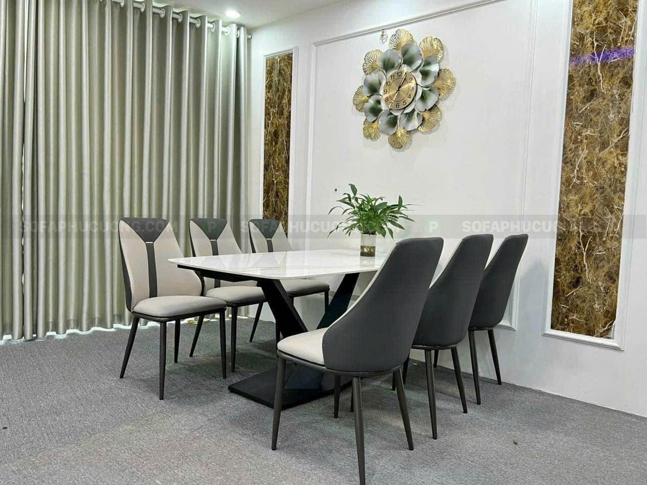 [BA063] Bộ bàn ăn chữ X 1m6 mặt đá 6 ghế hiện đại