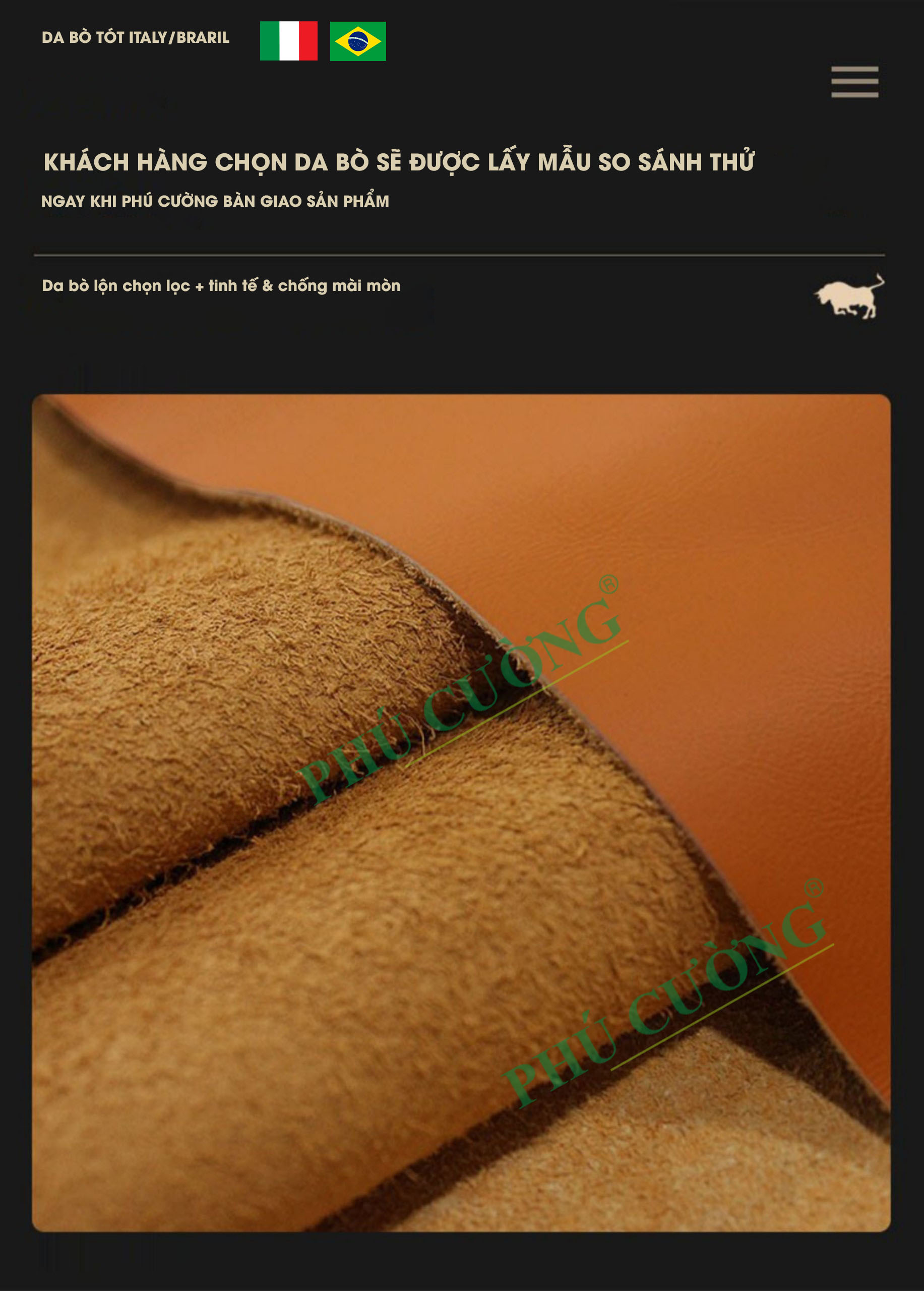 Đầu tiên, sofa da nhập khẩu tại Phú Cường đảm bảo chất lượng cao. Chúng tôi chỉ nhập khẩu những sản phẩm sofa da chất lượng tốt nhất từ các quốc gia nổi tiếng như Ý, Tây Ban Nha, và Mỹ.